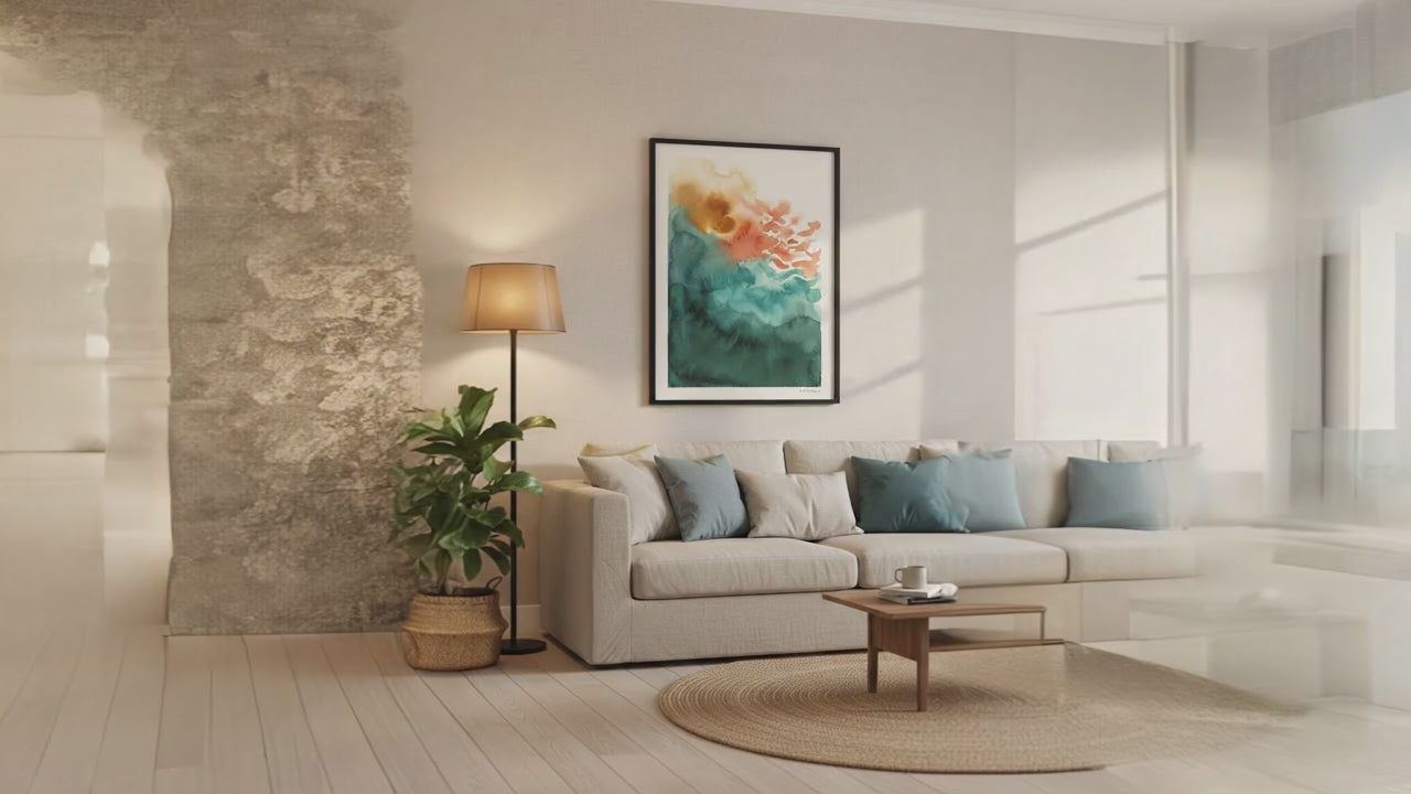 Aquarelle abstraite teal corail or | Affiche mer dramatique